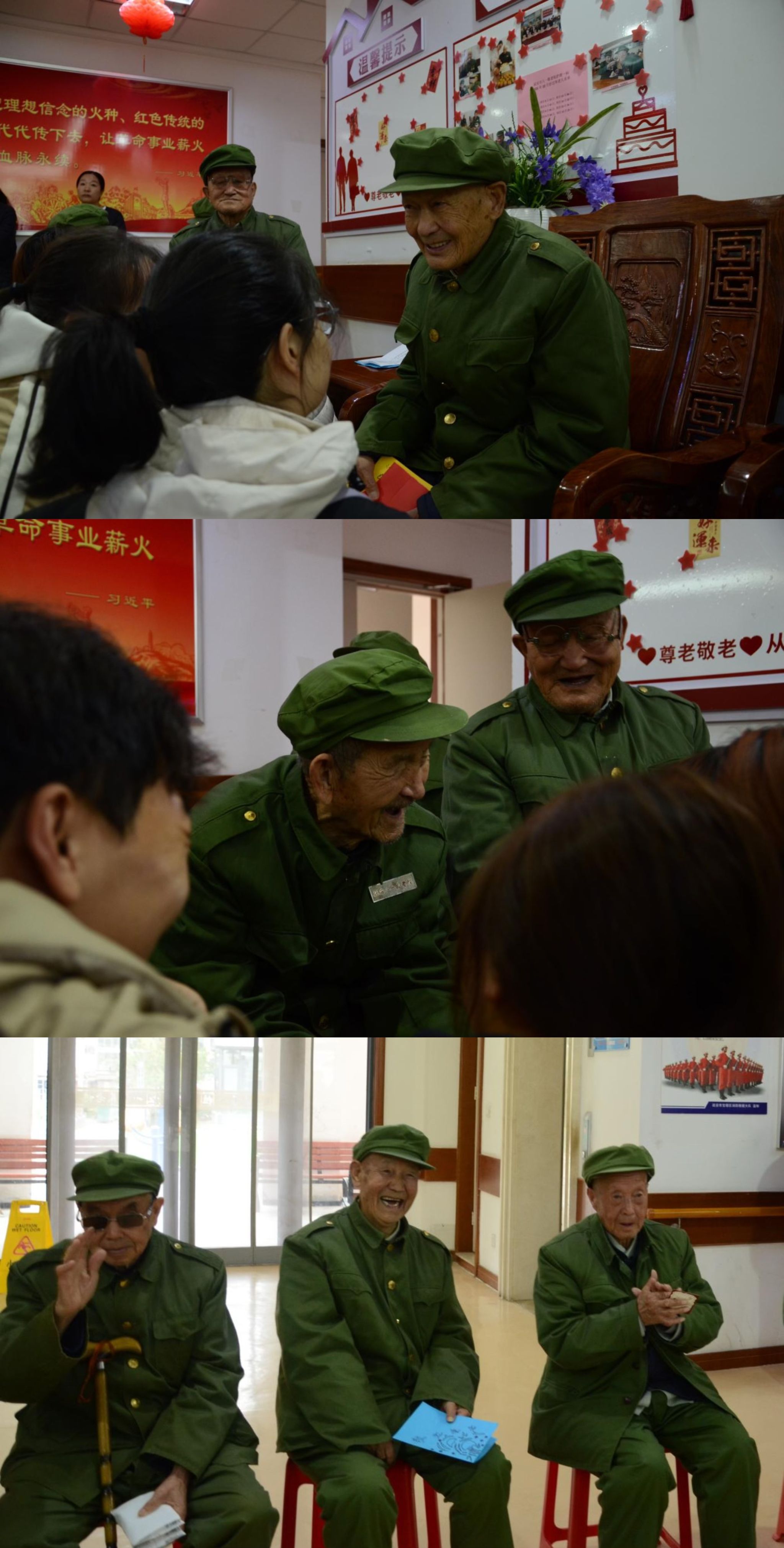 随后,志愿者们结合自身优势,开展多形式特色服务:研究生志愿者代表以诗朗诵《延安,我把你追寻》为载体,用“追寻”的姿态传递对老兵的敬意,搭建起与老兵的“精神共鸣”桥梁;学院研究生党支部马子文以“政策宣讲志愿者”身份,结合学习体会开展党政微宣讲,为老人们通俗解读党的政策理论、分享新时代发展成就;退伍大学生黄艳则发挥军旅经历优势,通过讲述军旅故事、表演踢正步与卧姿匍匐前进等军事动作,带来特色文化服务,铿锵有力的表现赢得老人们阵阵掌声。