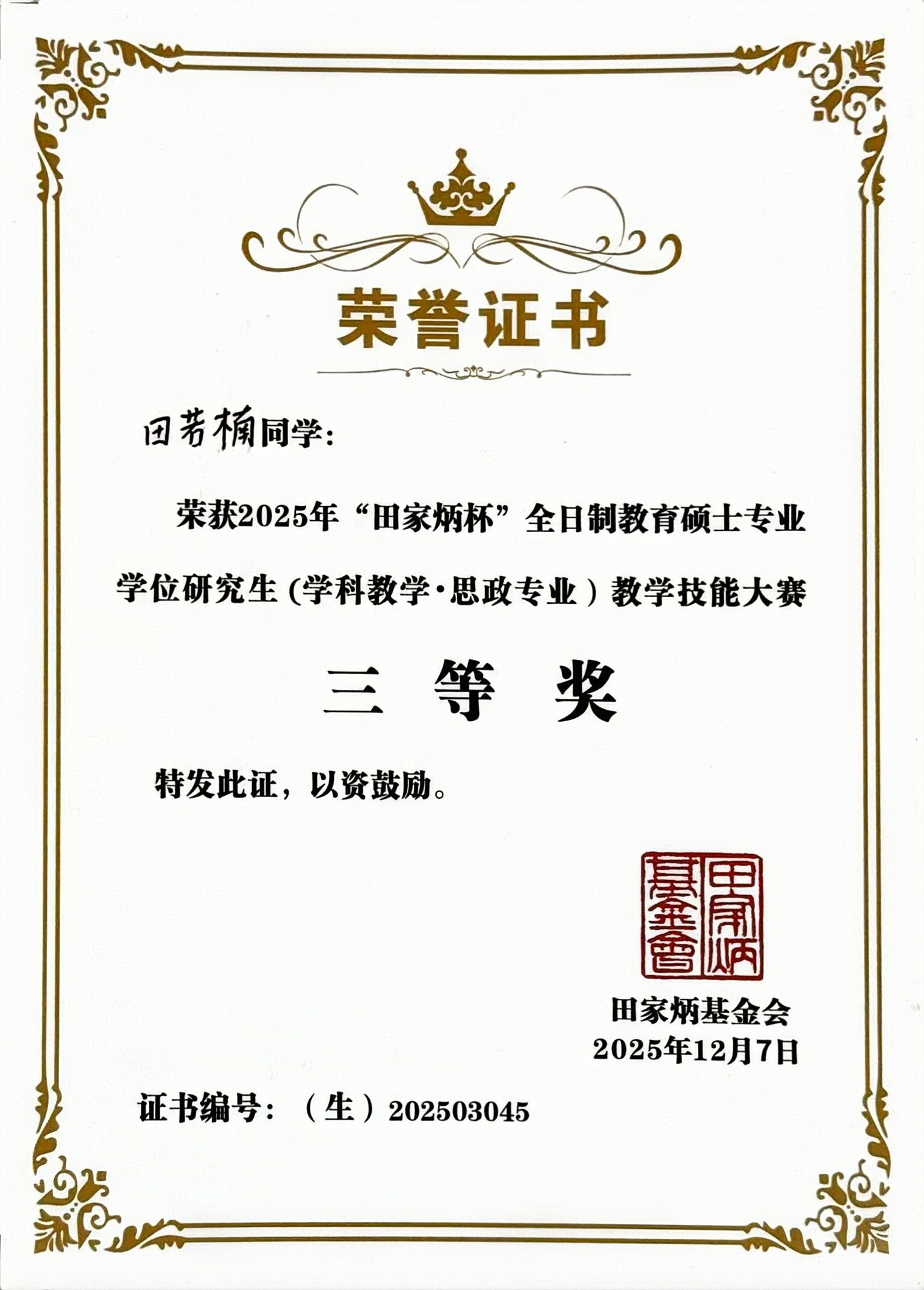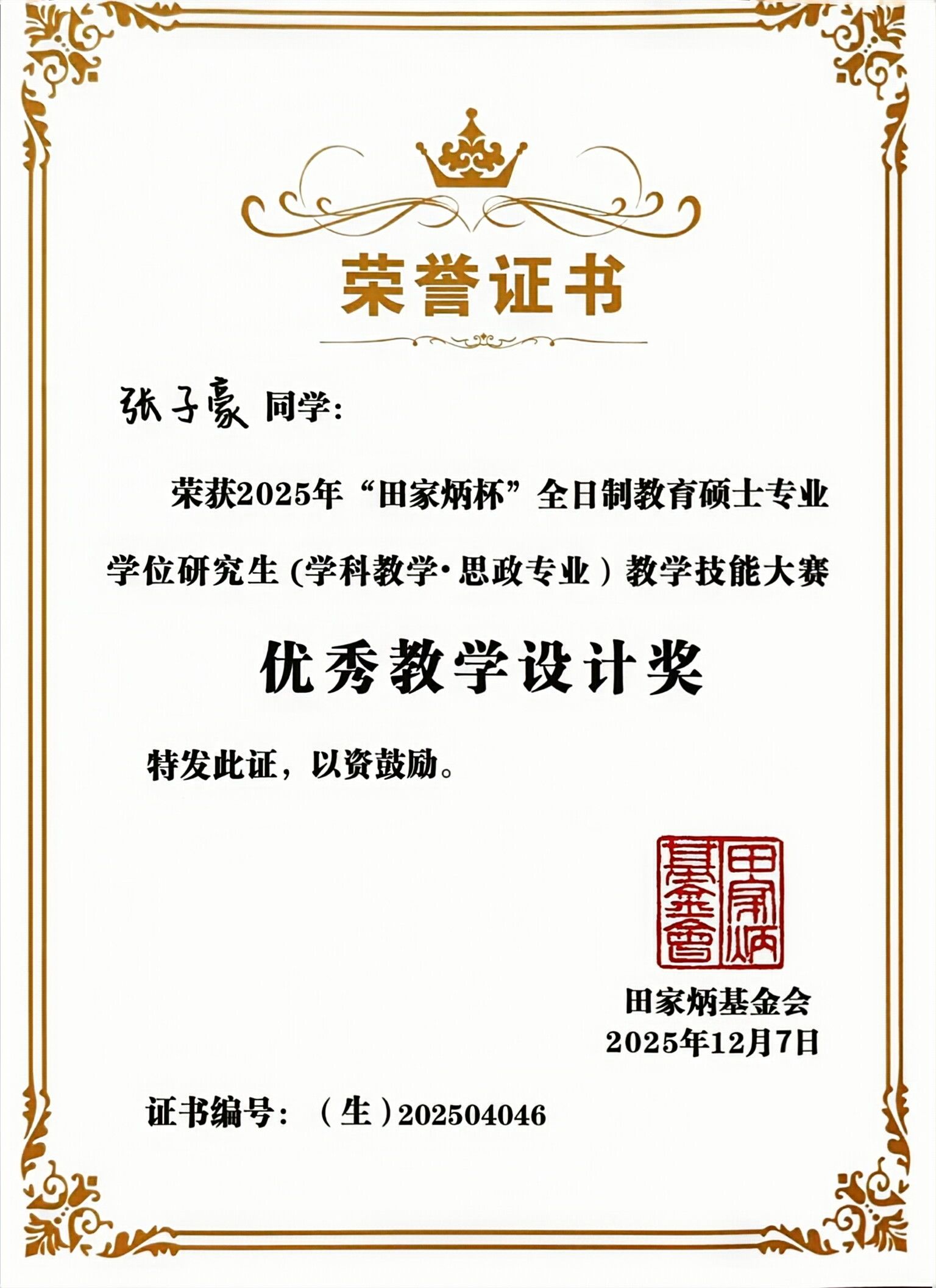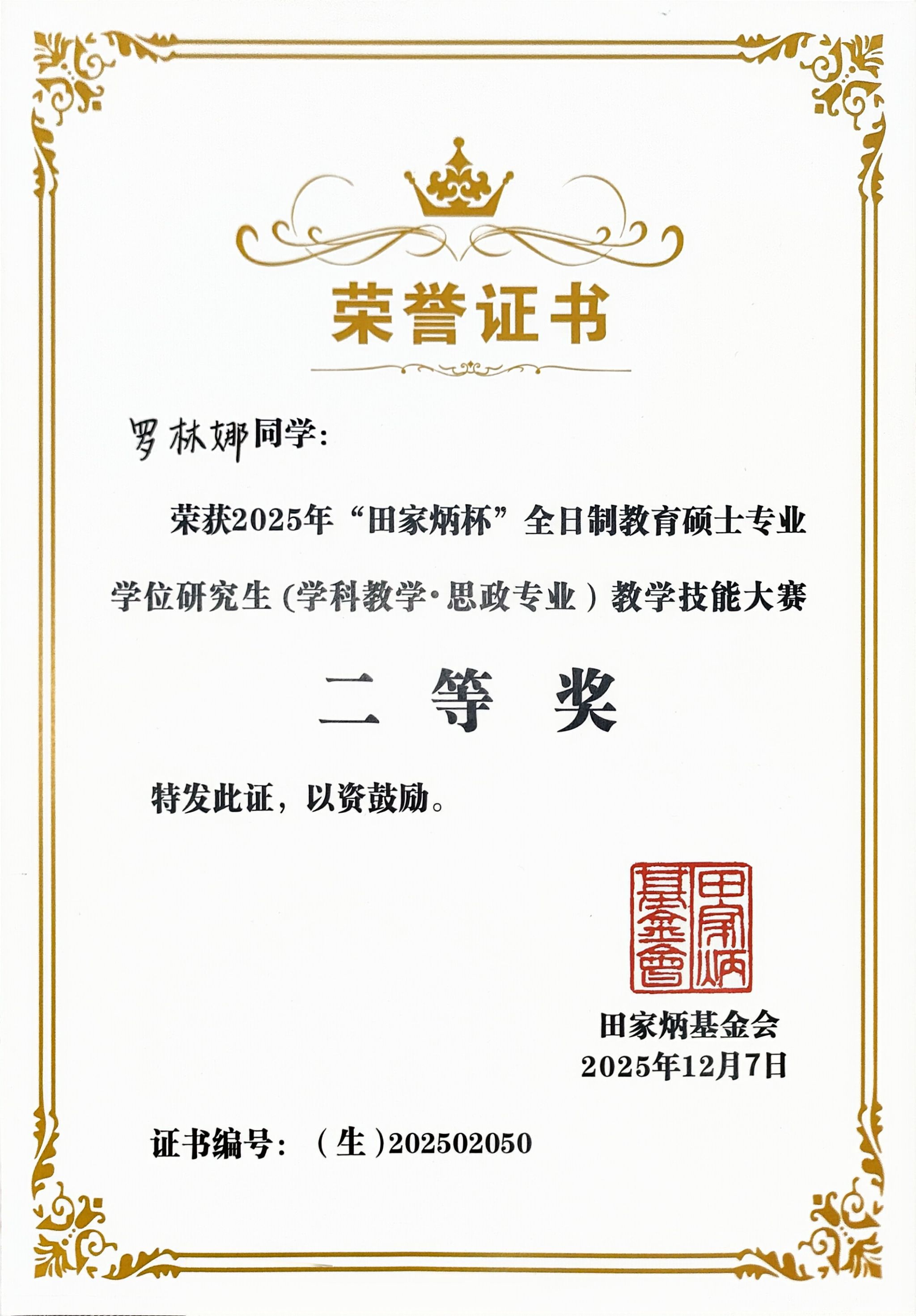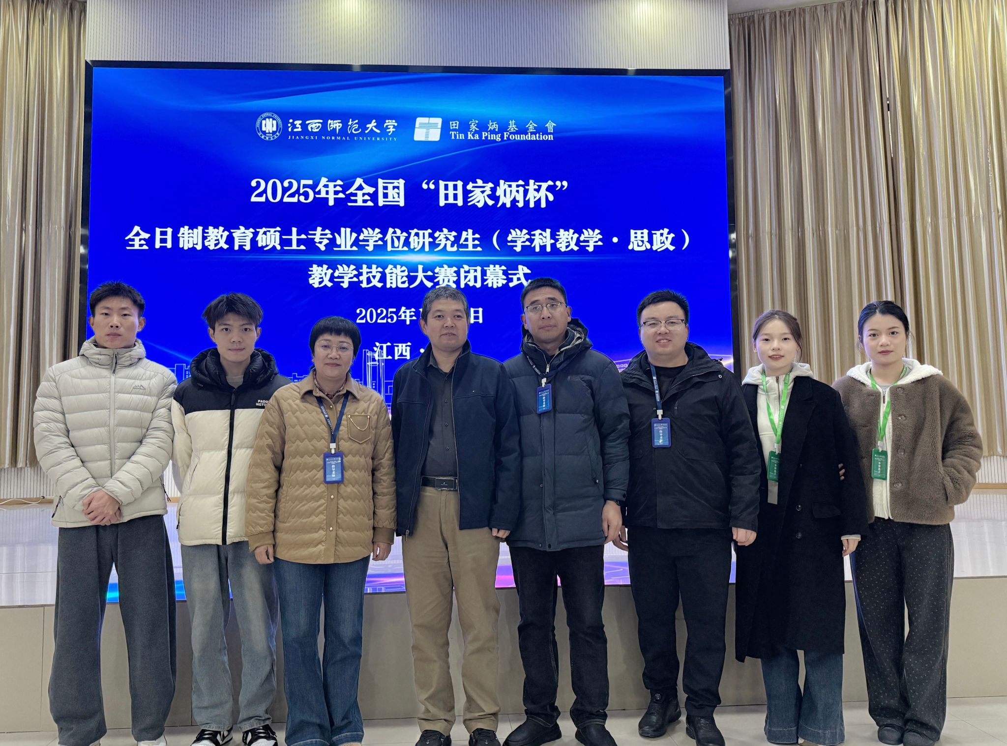 12月4日至7日,2025年全国“田家炳杯”全日制教育硕士专业学位研究生教学技能大赛在江西师范大学举行,我院学科教学(思政)专业2024级研究生罗林娜、田若楠、何小宇、张子豪四位同学代表学校参赛。经过激烈角逐,罗林娜获二等奖,田若楠、何小宇获三等奖,张子豪获优秀教学设计奖。获奖数量与质量均创该专业历史新高。充分展现了我院在师范生培养和教育教学改革方面的扎实成效,实现了该专业研究生培养成果的新突破。