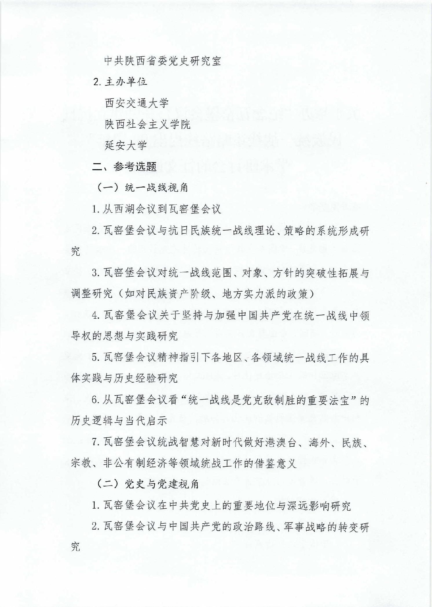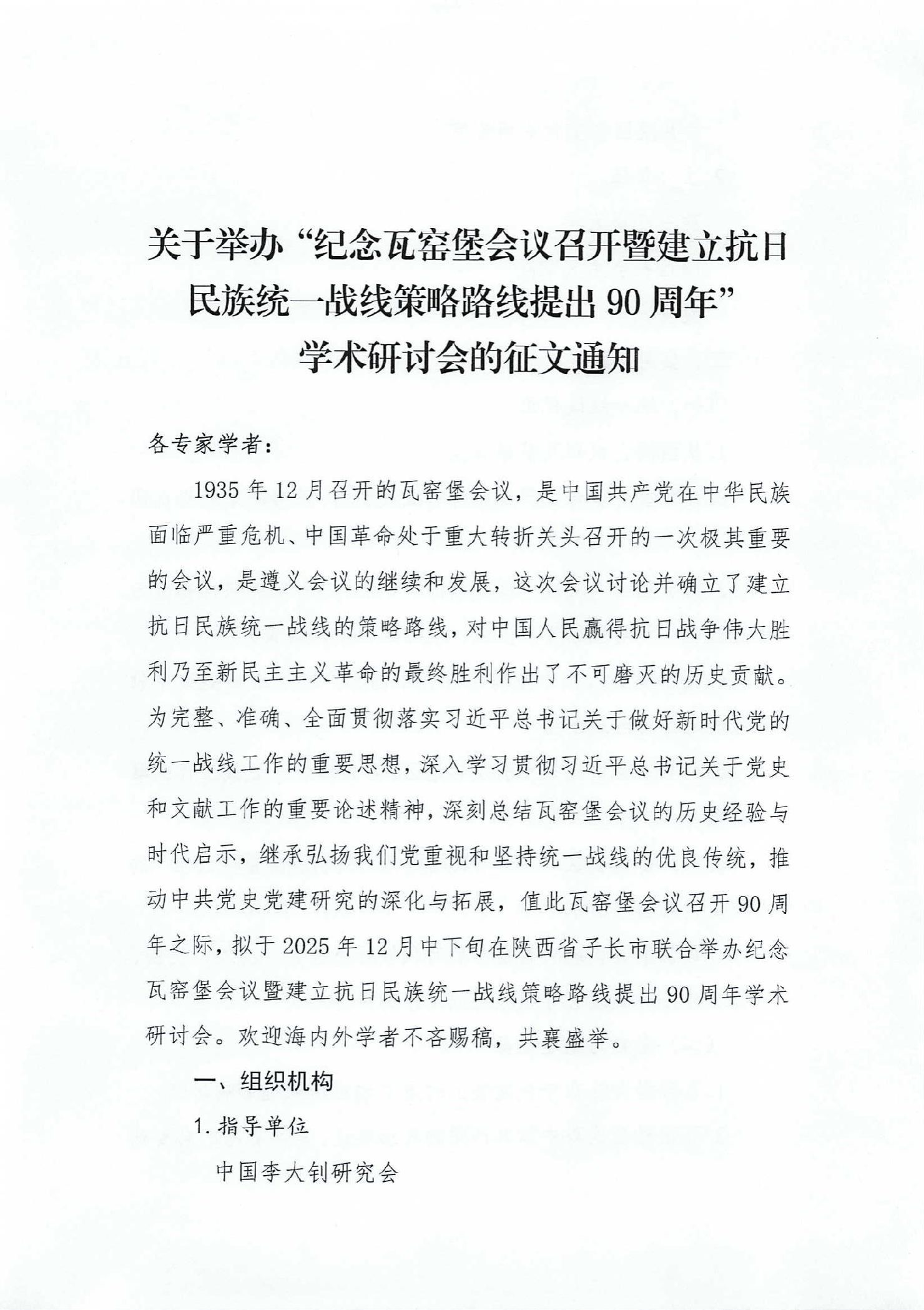 关于举办“纪念瓦窑堡会议召开暨建立抗日民族统一战线策略路线提出90周年学术研讨会的征文通知