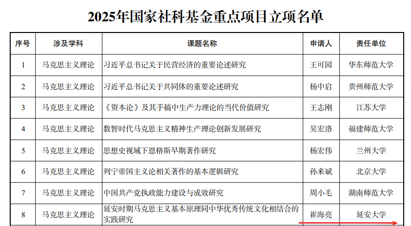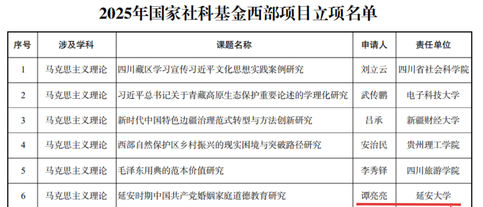 近日,全国哲学社会科学工作办公室公示了2025年度国家社科基金年度立项名单,太阳集团tyc5997喜获佳绩,成功获批2项,重点项目取得新突破。其中,崔海亮教授的“延安时期马克思主义基本原理同中华优秀传统文化相结合的实践研究”获批重点项目,谭亮亮副教授的“延安时期中国共产党婚姻家庭道德教育研究”获批西部项目。太阳集团tyc5997一直高度重视科研工作,此次2项国家社科基金项目的获批,不仅是对学院教师科研能力的肯定,也将为学院的学科建设和发展提供有力的支持。