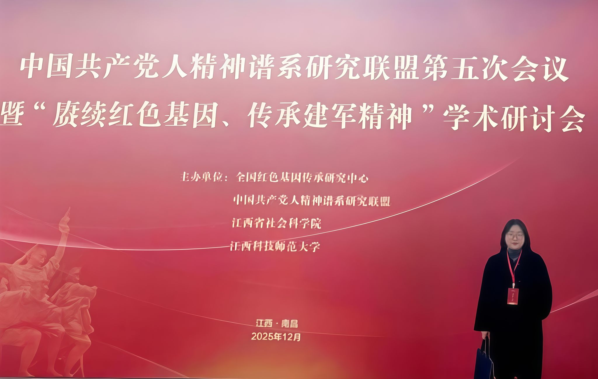 为深入学习贯彻习近平文化思想和习近平总书记关于传承红色基因的重要论述,聚焦2027年建军百年,不断深化对南昌起义蕴含的伟大革命精神的研究阐释,弘扬伟大革命精神,全国红色基因传承研究中心、中国共产党人精神谱系研究联盟、江西省社会科学院、江西科技师范大学等于2025年12月5日至6日在江西南昌举办中国共产党人精神谱系研究联盟第五次会议暨“赓续红色基因、传承建军精神”学术研讨会。我院马克思主义中国化研究方向2024级研究生张珂煜向大会提交论文《延安精神与照金精神的内在联系及其时代价值》经评选成功入选论文集,并受邀参会在分论坛“中国共产党人精神谱系研究”中进行交流发言,该论文得到了点评专家与多位参会学者的积极回应与一致认可。