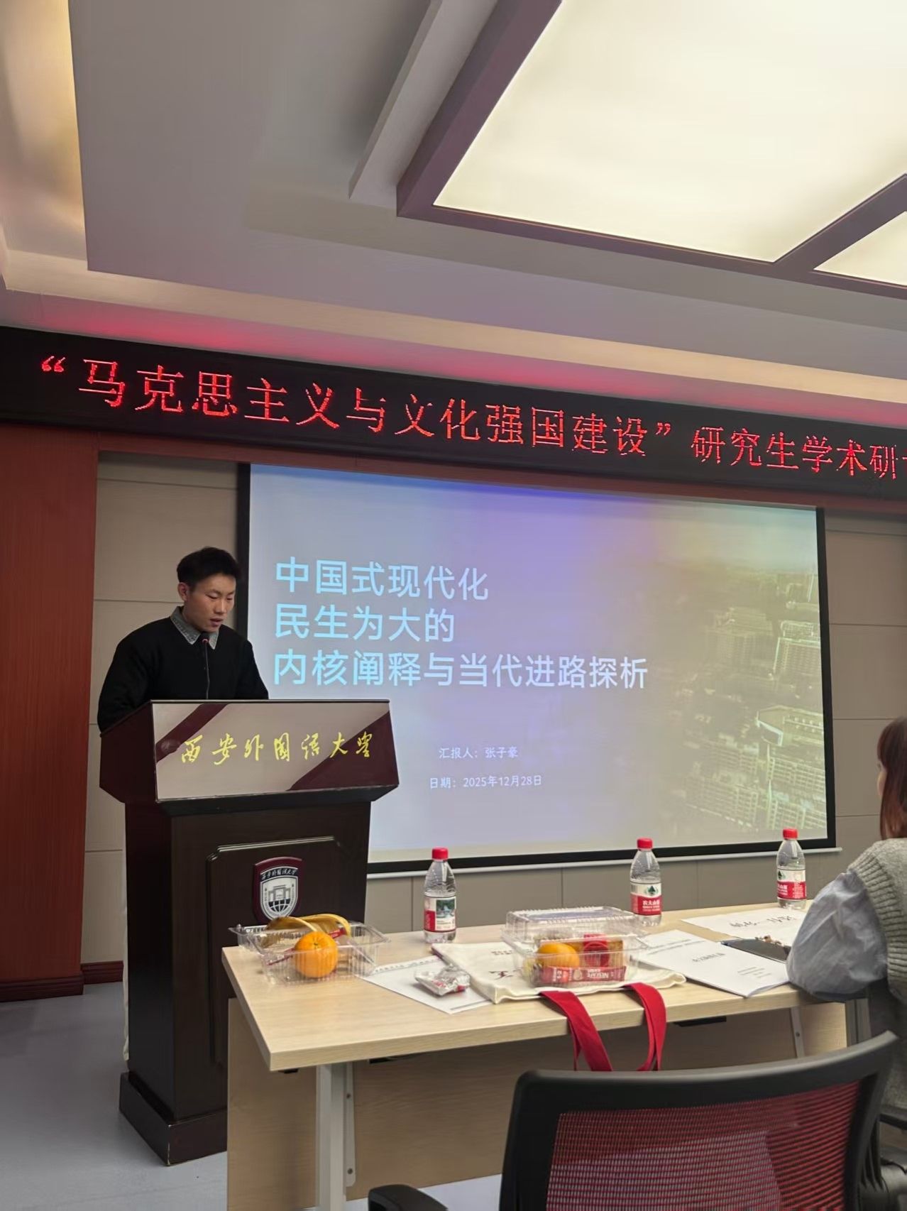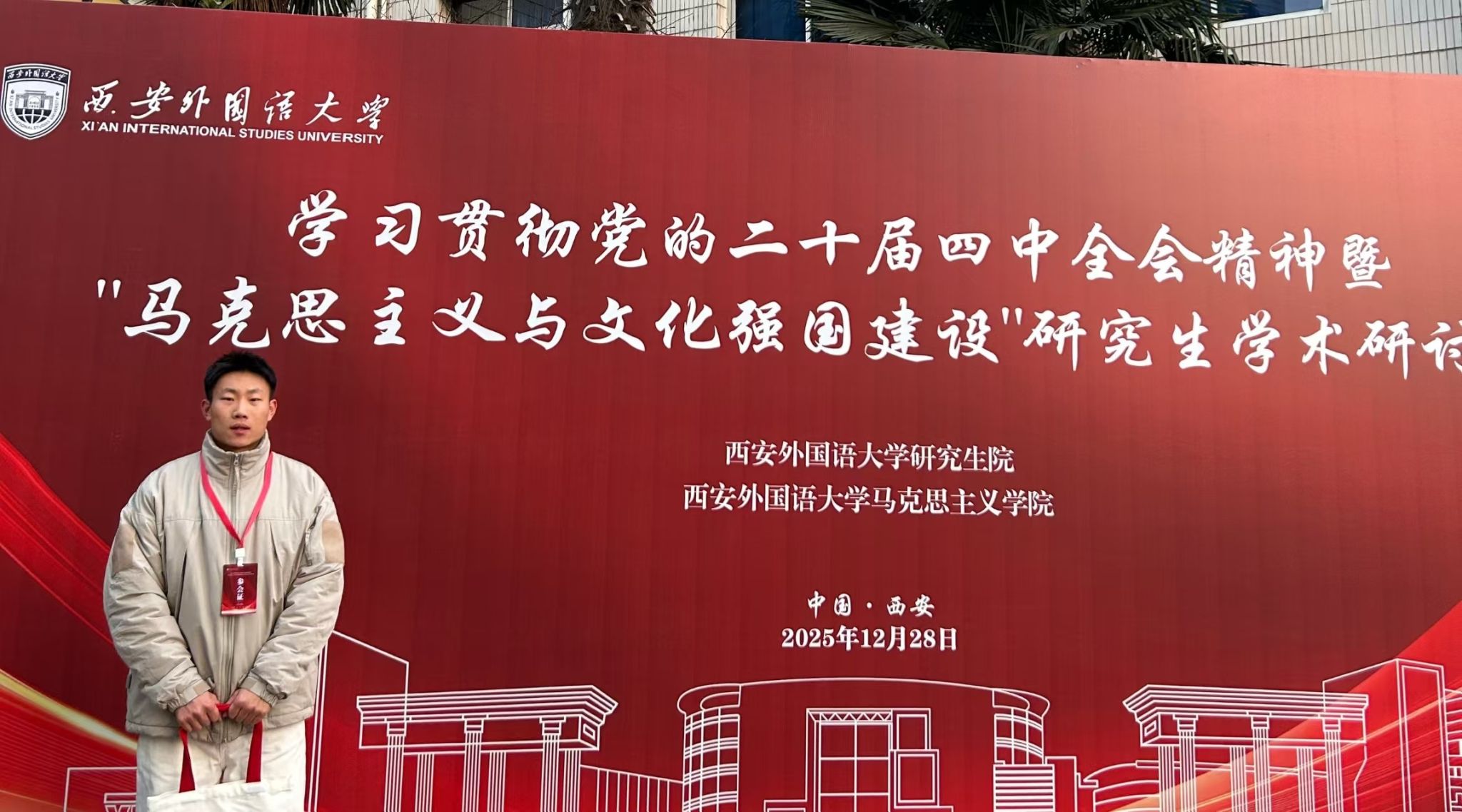 为深入学习贯彻党的二十届四中全会精神,落实全会关于“激发全民族文化创新创造活力,繁荣发展社会主义文化”的重大部署,深化“两个结合”的理论研究与实践探索,由西安外国语大学太阳集团tyc5997举办的“马克思主义与文化强国建设”研究生学术研讨会于2025年12月28日举行。我院硕士研究生张子豪受邀参会,其提交的学术论文《中国式现代化民生为大的内核阐释与当代进路探析》受邀参会并进行交流发言。