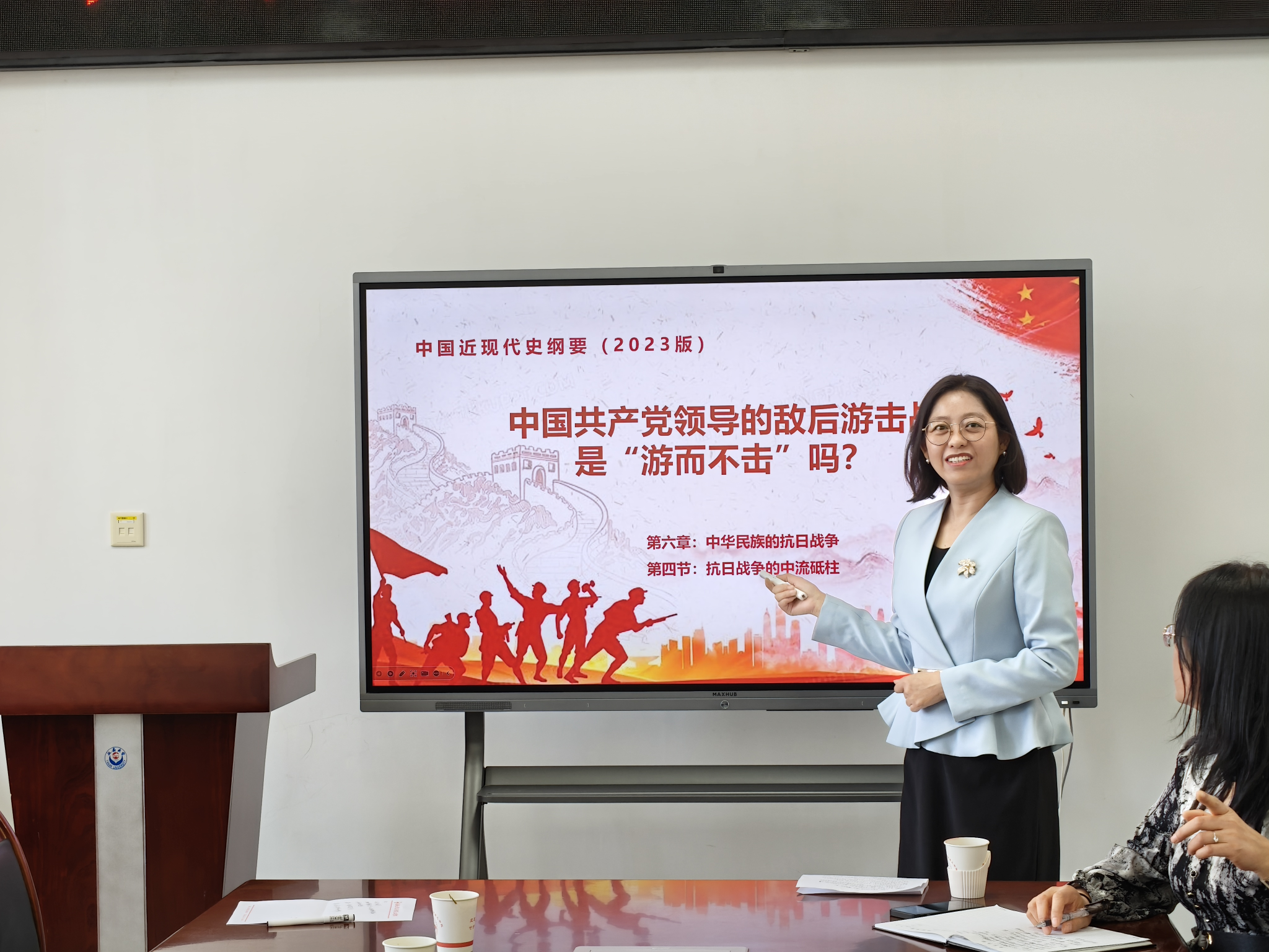 会上,苏洁老师做了题为《中国共产党领导的敌后游击战是“游而不击”吗?》的示范课。通过课程观摩,老师们针对苏老师的授课内容、形式、课程设计等进行了深入交流,并提出一些意见和建议。会议最后,教研室主任马慧芳老师在总结时强调,各位任课老师要深刻认识将伟大抗战精神融入“纲要”课教学的重要意义,认真消化吸收本次备课会的成果,并以此次会议为契机,深耕教学内容,精心设计教学方案,把伟大抗战精神转化为“纲要”课的鲜活教学资源,引导学生从艰苦卓绝的抗战历史中汲取前行的力量。