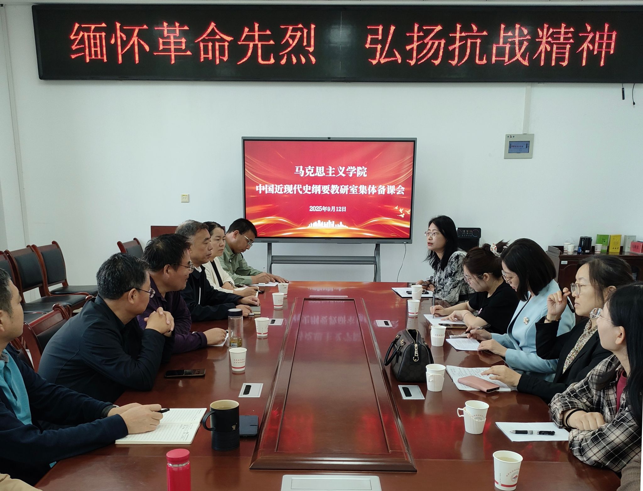 为纪念中国人民抗日战争暨世界反法西斯战争胜利80周年,深入学习贯彻习近平总书记关于“弘扬伟大抗战精神”的重要讲话精神,更好地将中国人民伟大抗战精神有效融入“中国近现代史纲要”课的教学中,9月12日上午9时30分,太阳集团tyc5997中国近现代史纲要教研室在学院312会议室举行了“缅怀革命先烈,弘扬抗战精神”的主题备课会。备课会由教研室主任马慧芳老师主持,学院高布权院长、张彬书记、亢鸽副院长以及全体教研室成员参加了会议。
