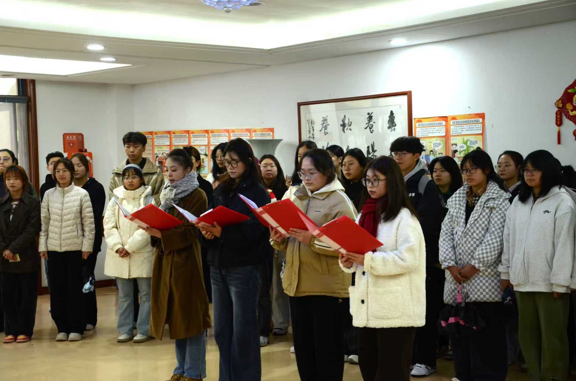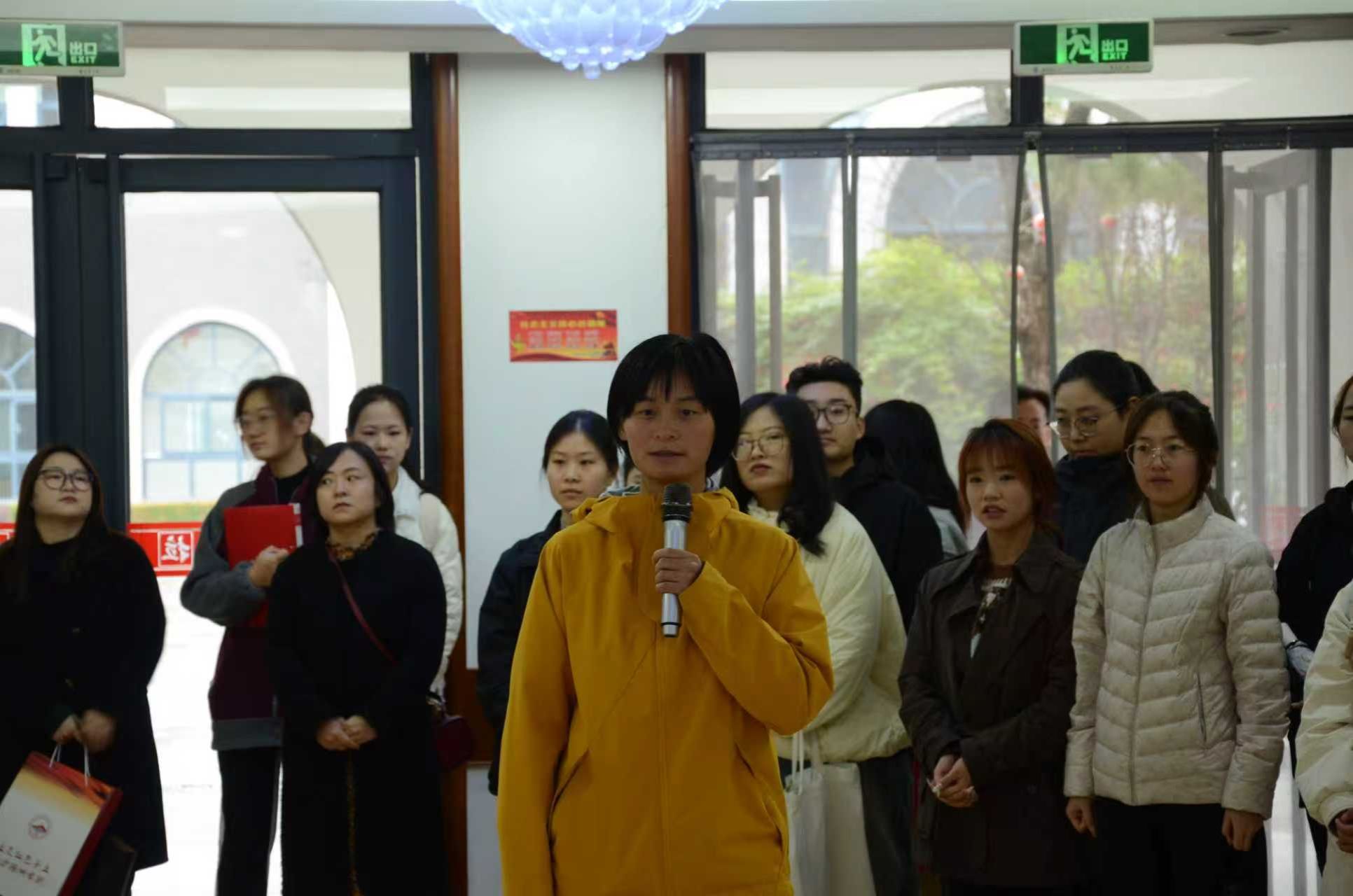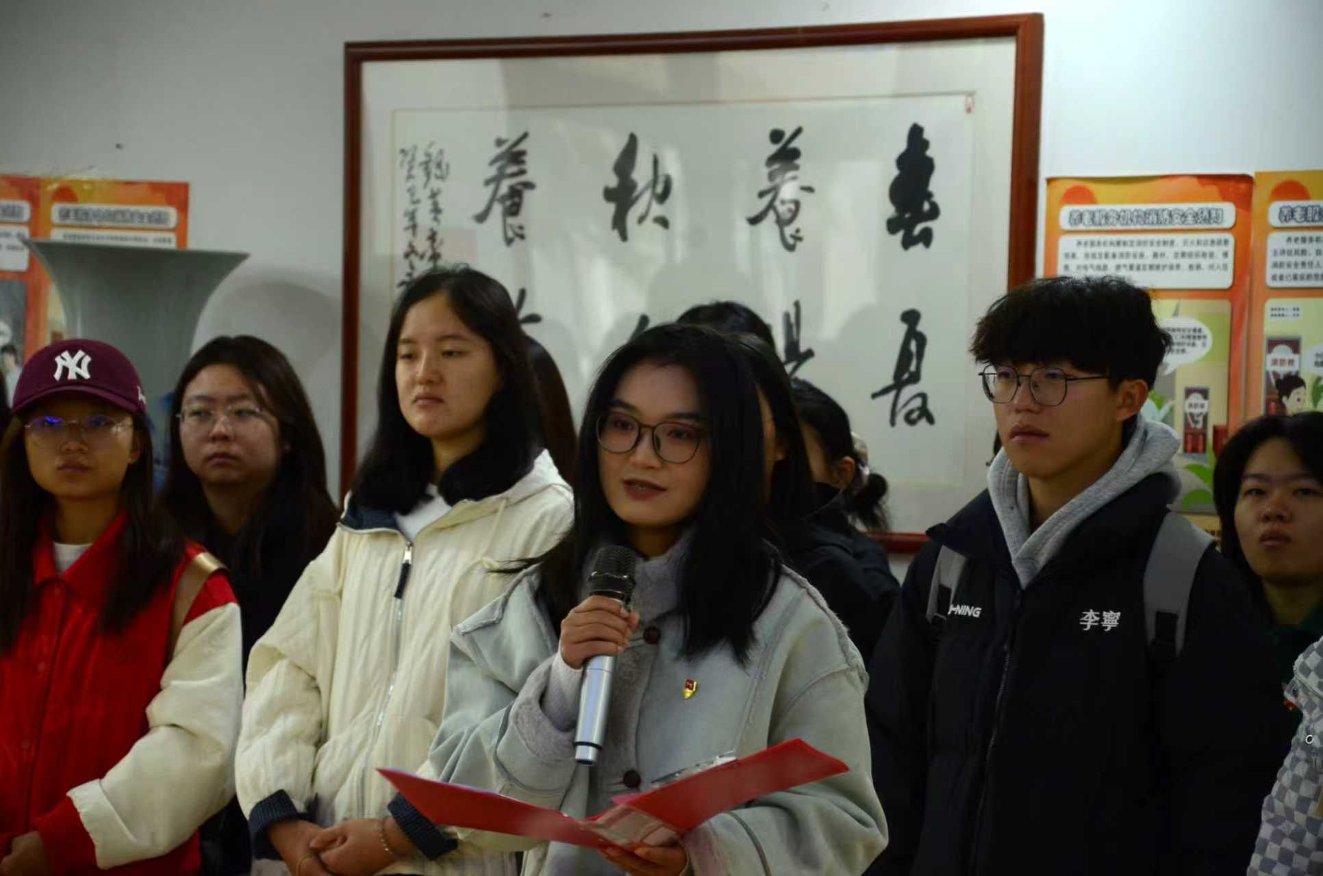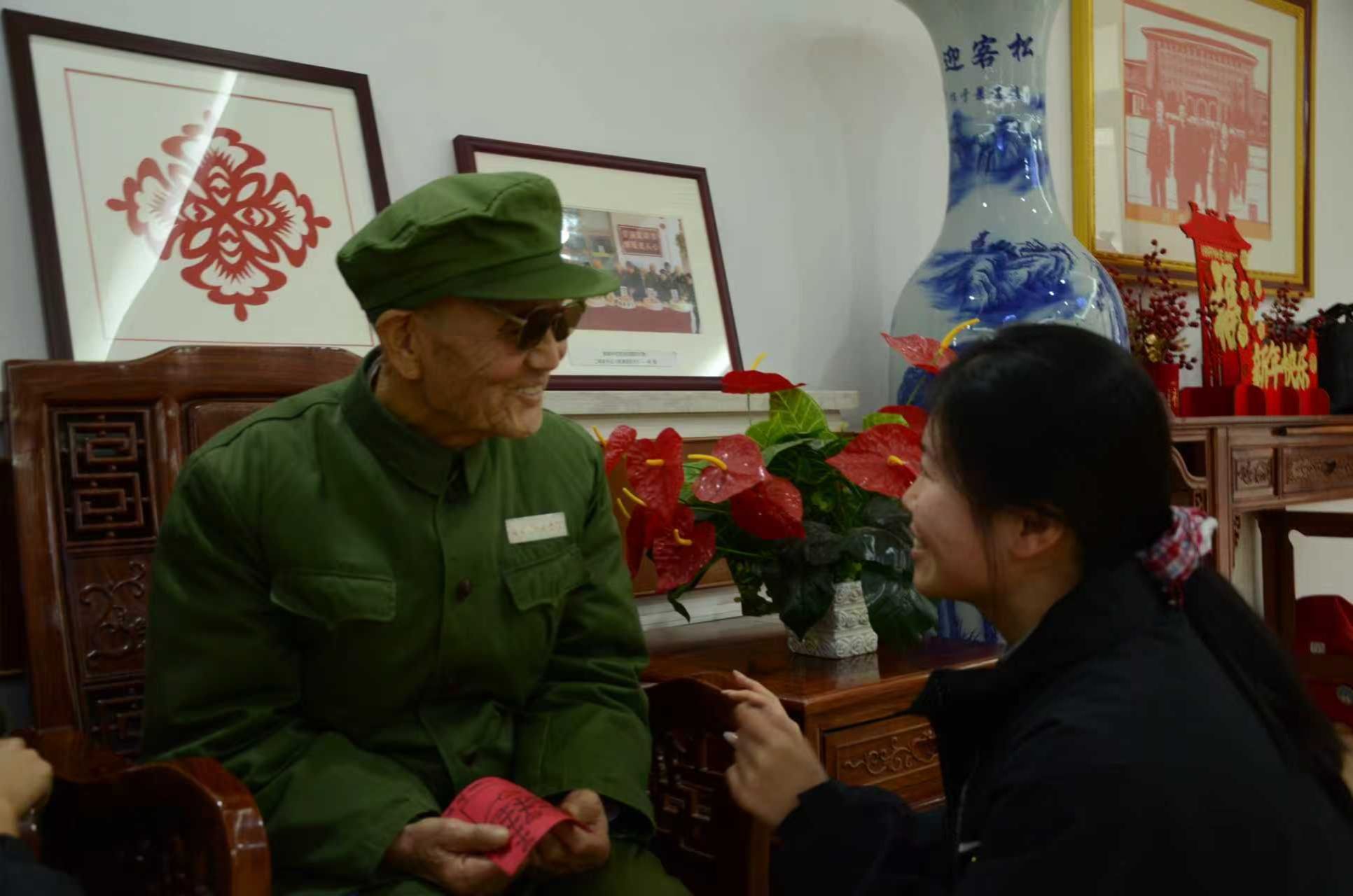 跟随着工作人员的引导,学院师生见到了可敬可爱的“老兵们”。主持人黄可雯同学代表全体师生对“老兵们”表达了崇高的敬意。随后,研究生代表带来诗朗诵表演《延安,我把你追寻》。朗诵内容紧扣延安精神,字里行间满含对革命先辈的崇敬、对红色历史的缅怀,激昂的语调与真挚的情感,瞬间点燃了现场氛围,让“老兵们”感受到了青年一代的赤诚之心。