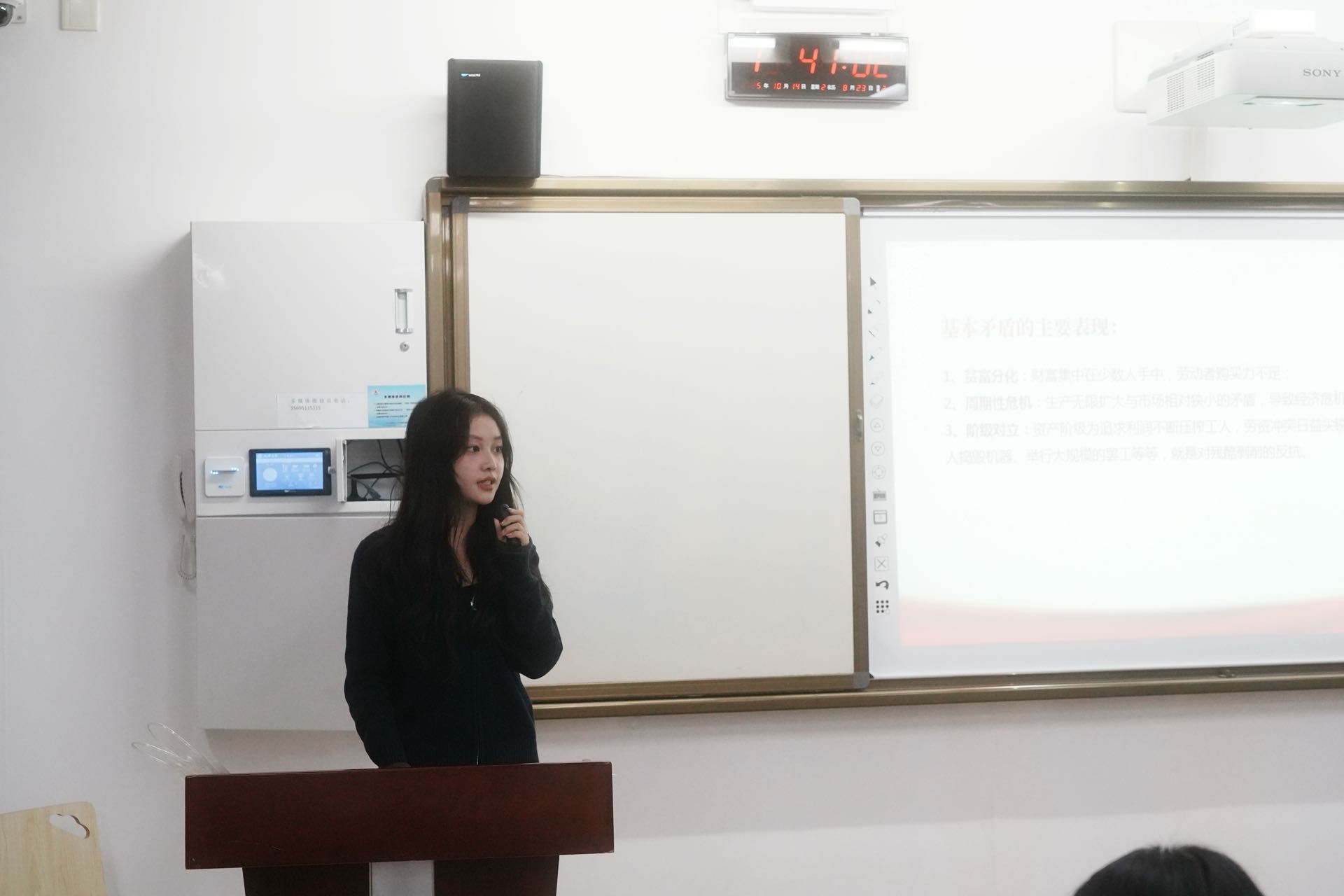 接下来第一位分享人是高翌萌。她着重对《共产党宣言》的引言及第一章中阶级斗争理论进行详细讲解。首先,她将关于此书目前的国内研究分为四个角度,分别是文本考据与传播史研究、基本原理的当代阐释与坚守、时代化与中国化的实践队对接及多学科视角的交叉融合,使同学们了解目前国内研究现状。其次她回到原文,详细分析了引言部分及马克思“阶级斗争理论”。再次,她通过有关《宣言》第一章部分的有关文献节选,为同学们提供两个重要的视角且使同学们更深刻地理解文本。最后她总结了“阶级斗争理论”两方面的现实意义。第一是作为“诊断工具”:穿透当代社会的“去阶级化”迷雾;第二首是作为“方法论武器”:在“身份政治”浪潮中坚守总体性视野。